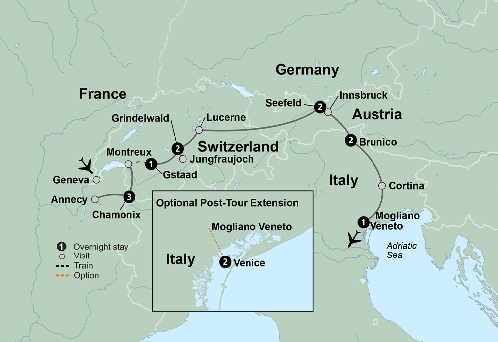 Embark on an invigorating journey through Europe’s towering Alps and idyllic towns. Ascend 4 unique mountains via cable car and cogwheel train. Join a mountain guide for a hiking experience. Visit Jungfraujoch and stand at the “Top of Europe.” Visit the cheese aging cellars of L’Etivaz and the Italian vineyards of Prosecco – enjoying a tasting at both. Spend time in the idyllic storybook towns of Lucerne, Innsbruck, and Cortina crowned by towering Dolomite Mountains. Across France, Switzerland, Austria, and Italy, discover breathtaking beauty and inviting local charm.