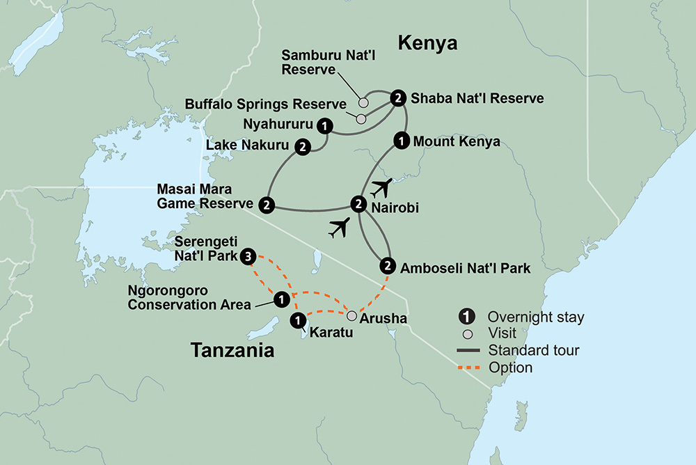 Enjoy Kenya's scenic vistas and magnificent wildlife as you traverse the African plains on an intimate safari adventure. In Swahili, “safari” means journey; to you, it will mean that – and so much more. Explore Kenya, home to incredible wildlife, from cheetahs to wildebeests. Discover the thriving cultures and innumerable natural wonders that make this one of the most popular African countries to visit. Go in search of elephants, lions, buffalo, rhinos, and leopards – collectively known as the “Big 5” and other animals on 13 game drives. Meet a member of the Samburu tribe who opens you up to the culture, folklore, and African traditions. Visit with Rothschild giraffes at the Giraffe Sanctuary. Visit the beautiful Masai Mara Game Reserve, and top off a full day game drive with a traditional dinner in the bush and a Masai dance performance. These are the plains of Africa, where unparalleled experiences greet you at every turn.